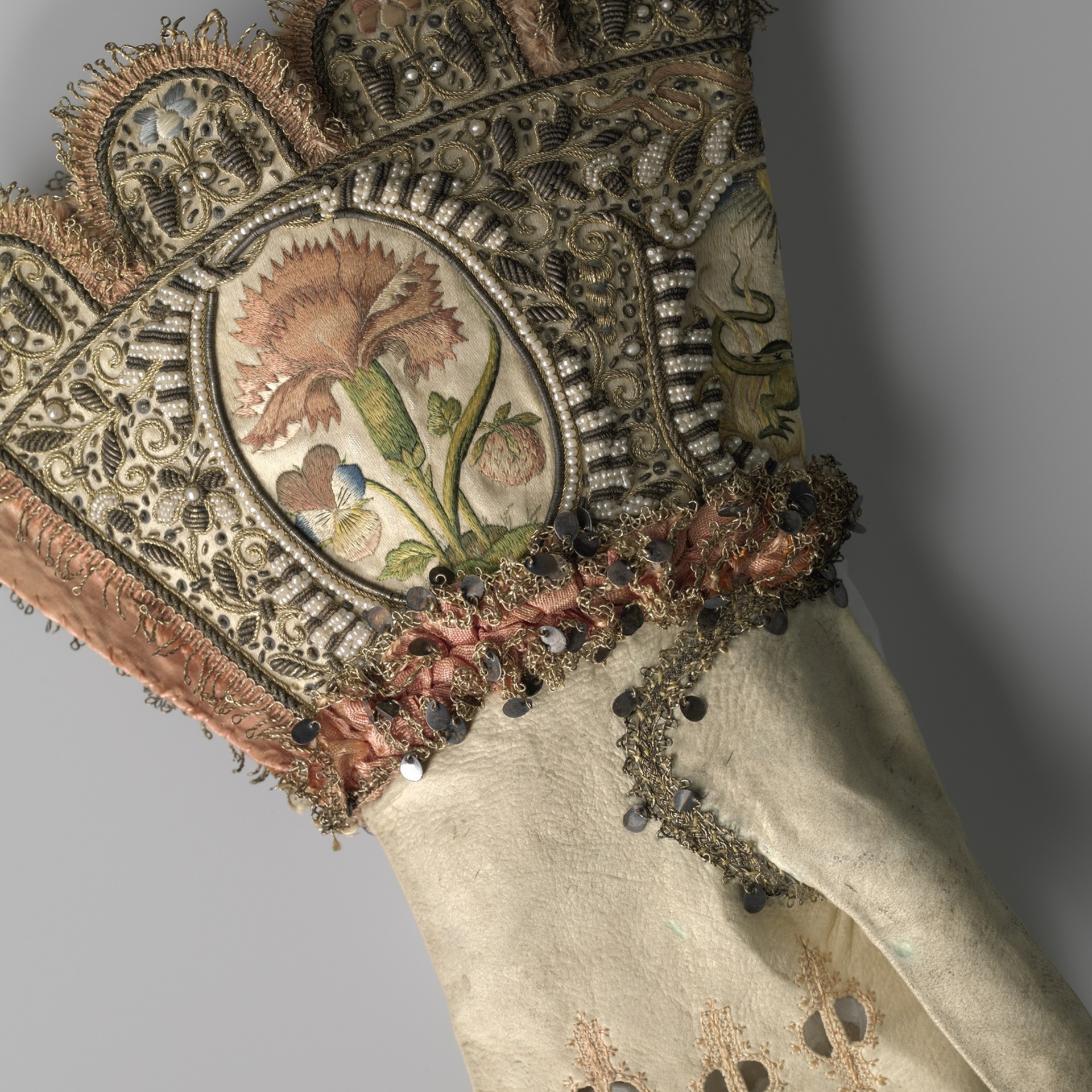 bruidshandschoenen, 1630-1640, leer, zijde, gouddraad, parels, pailletten, Amsterdam Museum, Amsterdam
