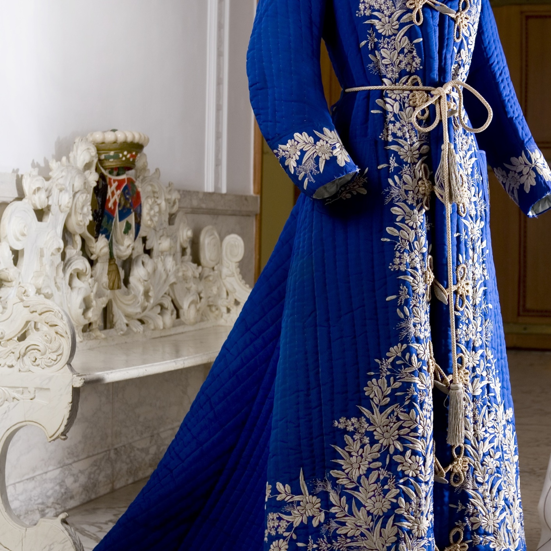 Aan het ontbijt en tijdens het wisselen van outfits hulde een welgestelde negentiende-eeuwse vrouw zich in een kamerjas. Dit zijden exemplaar is gemaakt in Japan, maar zowel het model als de geborduurde decoratie is afgestemd op de Europese smaak. De kamerjas is een toonbeeld van luxe en een intiem pronkstuk pur sang.