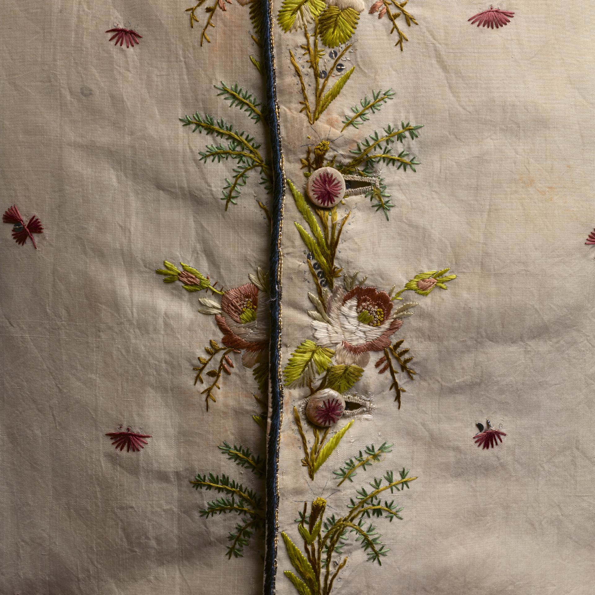 Dat borduurwerk niet alleen is voorbehouden aan vrouwen, bewijzen deze achttiende-eeuwse mannenvesten. Professionele mannelijke borduurwerkers verrijkten in hun ateliers de zijden patroondelen met verfijnde geborduurde decoraties. Kleermakers, ook vaak mannen, zetten de vesten vervolgens in elkaar.